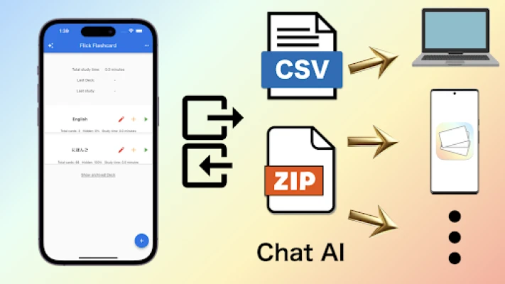 Flick Flashcard, flashcard verilerini yaygın dosya formatları olarak içe ve dışa aktarabilir. (.csv / .zip)