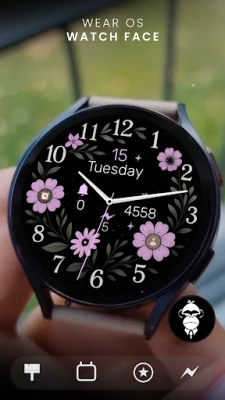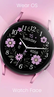 This elegant analog watch face for Wear OS combines a classic design with beautiful purple flowers.