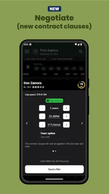 ✍️ Contract Clauses: Handle contract negotiations with new options like No Trade Clauses (NTC), Player Options and Team Options to add more strategy.