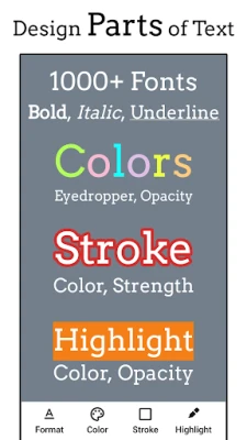• 1000'den fazla yazı tipi • Yazı tipi ekleme • Metnin ayrı bölümlerinin farklı stilleri olabilir • Son iş her zaman kaydedilir • Şeffaf görüntü desteği • Metin rengini değiştir • anahat metni • Metni vurgulamak • Aralık • Perspektif metni • Metin Eğme: bir eğri boyunca metin • Gölge • Gradyan • Metnin dokusu • Metin Saydamlığı • Çıkartmalar • Fotoğraf ekle • Geri Al ve Yeniden Yap • Fotoğraf Kırpma • Fotoğrafı Yeniden Boyutlandır • Kare Fit • Çevir ve Döndür • JPEG veya PNG olarak kaydet