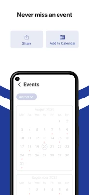 NEVER MISS AN EVENT The event section shows a list of events throughout the district. Users can add an event to their calendar and share the event with friends and family with one tap.