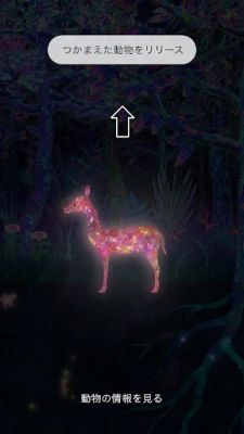 つかまえた動物は、アプリのカメラで見えている場所にスワイプすると、その場所にもどります。
