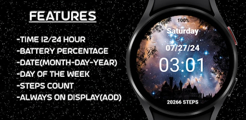Digital Galaxy Castle Universe Space Stars Watchface for your Wear OS smartwatch! Watchface is available on devices running Wear OS API level 28 and higher. English watchface only. Thanks and enjoy!