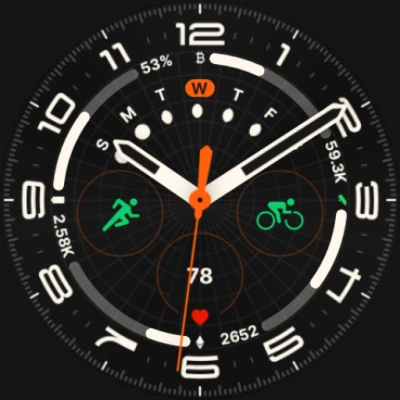 Galaxy Watch Ultra inspired watch face for Wear OS, with seven configurable complication spaces, two arc widget spaces and ultra sophisticated styling.