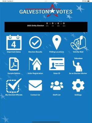The GalvestonVotes App provides information on election dates and times; interactive maps showing voters their nearest Voting Location along with directions on how to get there; and information on countywide voting, ID requirements, and how to contact Galveston County Elections. There are also sample ballots, an election calendar, and election return information on Election Night.