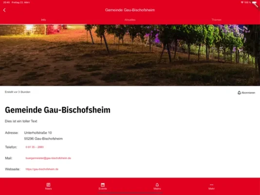 Installiere die App und überzeuge dich selbst! Du möchtest auch in der Gau-Bischofsheim App veröffentlichen? Dann kontaktiere uns unter app@gau-bischofsheim.de.