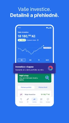 • Investování: Investujte do ETF, podílových fondů, cenných papírů nebo třeba i jen do části akcií a sledujte jejich vývoj přímo v aplikaci.