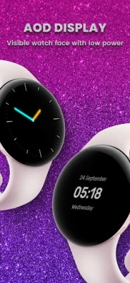 Easily personalize the look with different color themes and complications. The glitter watchfaces app also offers the Always-On Display (AOD) feature. So now it's no worry to wake up or tap the watch for viewing time.