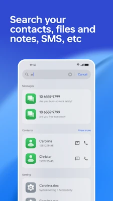 ●Search your phone Go to the search page from the Laundher and search for more content through Global Search Service,including local contacts,App Store, local apps, files, settings, notes, calendar, etc on mobile phone.