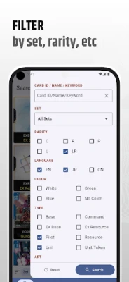 Search cards fast with beautiful UI/UX. Filter by name, set, rarity, language, color, type, art, cost, power, ap, hp, zone, link, trait and effects. Ideal for anyone managing their GNDM TCG card list or building competitive decks.