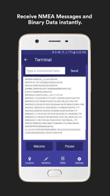 - Send commands to external GPS device and view the output data on Terminal.
