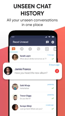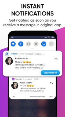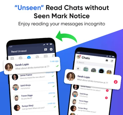 sohbeti görmeden okumak ister misiniz? Facebook, whatsapp veya herhangi bir messenger'da görülen facebook durumunu gizlemenize ve silinen mesajları okumanıza olanak tanıyan yeni bir facebook messanger gizli uygulaması. Görünmeyen mesajlaşma uygulamasını edinme ve daha önce web'de olabilecek gizli mesajlar içindeki bu gizliliği yeniden kazanma zamanı. Bu uygulama size herhangi bir mesajcıda görülme durumunu gizleme ve herhangi bir mesajı mavi tik veya görülen bildirimler olmadan okuma özgürlüğü verir. Bu uygulama, Instagram WhatsApp Messenger Line VK ve diğerleri gibi tüm popüler anlık mesajlaşma programlarında görülmeden mesajları görüntülemenize olanak tanır.