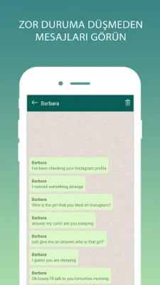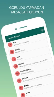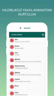 Görünmeden Mesaj Okuyucu, silinen mesajları da kayıt eder. Silinen bir WhatsApp Mesajını görmek istiyorsanız, bu uygulamadan okuyabilirsiniz. Silinen mesajlar WhatsApp'ta gizli olsa da, telefonunuza kaydedilir.
