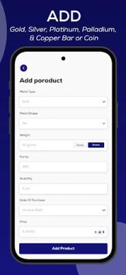 • Enter details like weight, purchase price, and type (bar, coin, etc.)