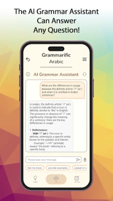- AI Chatbot: Encounter a grammar hurdle? Our intelligent AI Chatbot awaits you with tailored responses to clarify doubts and guide you through Arabic grammar queries on the fly.