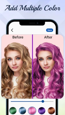 You may also alter the hair color in your gallery photos with this app. Just import a photo from the gallery on your device, choose the hair color choice, and then save the image to the gallery.