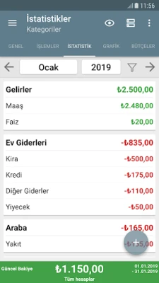 • İstatistiklerinizi tablo veya grafik olarak görüntüleme ve tüm kazanç ve harcamalarınızı kategoriler halinde sunarak para akışınızı gösterebilme.