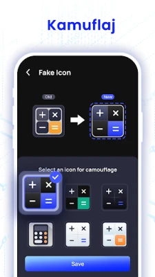 • Benzersiz şifre uygulaması ayarı: Gizli hesap makinesi fotoğraf kasasıyla şifrenizi veya deseninizi istediğiniz zaman sıfırlayabilir ve alabilirsiniz.