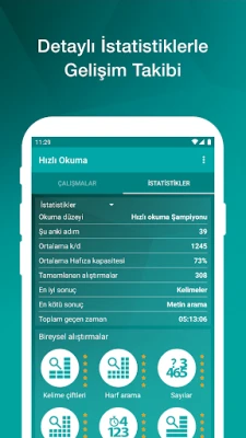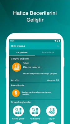 Hızlı Okuma, birçok eğlenceli ve öğretici interaktif alıştırmalar sayesinde okuma hızınızı ve beynin hafızaya yerleştirme ve hatırlama becerilerini geliştirir.