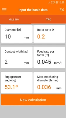 Calculate the relevant parameters for your application using a few entries. In this case, it is possible to calculate the cutting width, feed rate per cutting edge, cut arc angle and the maximum cutting thickness.