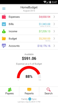 2. Family sync. HomeBudget includes Family Sync, an advanced feature that allows a group of devices within the household (Android, iPhone, iPad) to exchange expense and income information, and work together within a single budget. Once setup, the devices sync with each other automatically over the air. Family Sync works across all features including Bills and Accounts. Please refer to the Family Sync Quick Start guide at http://www.anishu.com for details.