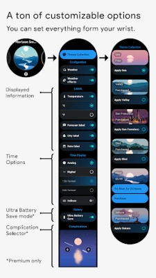Horizon, Wear OS akıllı saatinizde bir minyatür animasyonlu dünyadır. Her temanın 2880 farklı arka planı vardır. 280'den fazla farklı tema ve renk paleti kombinasyonu mevcuttur.