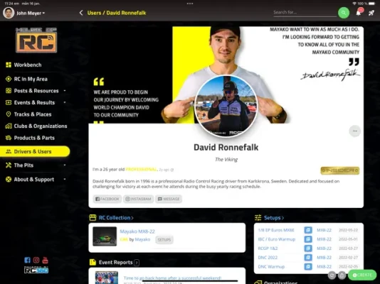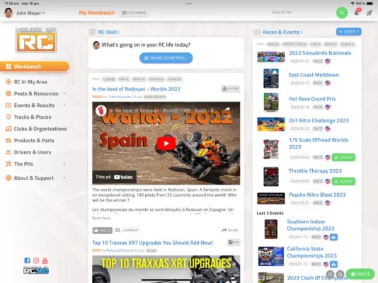 Build your RC profile, add your products, find stores and clubs nearby. Create events or attend races and competitions. Add your favourite online resources like Facebook, YouTube, homepages, forums and others about RC. Build your network of friends and brands or teams you like.For all type of RC on land, in water and in the air. For all type of people and all kind of organisations. Together we build something great, for the community by the community!