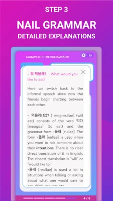 1. Every lesson consists of a specific Korean exercise routine that is designed to let the student master the Korean grammar and Korean vocab to achieve fluency level.