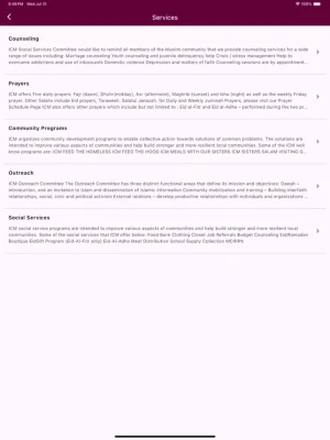 The Islamic Center of Maryland (ICM) is a non-profit organization with an operational philosophy based on the Holy Qur'an and the Sunnah of Prophet Muhammad (peace be upon him). Muslim families who visit the ICM facilities work towards fulfilling their religious obligations and striving for spiritual, intellectual, social and economic well-being and advancement. The center provides various services to the community.With this App Stay in touch with Day to day eventsGet regular prayer timesStay connected with community
