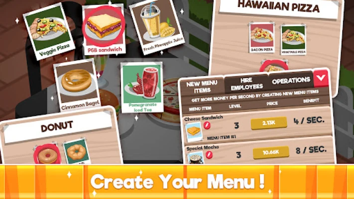 - Upgrade your cafe and equipments to unlock lots of food recipes and ingredients