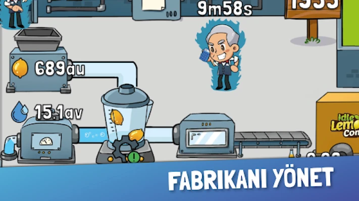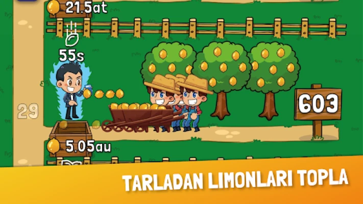 Limon hasadını ve fabrikayı otomatikleştirmek ve anlamsız tıklamalardan kaçınmak için, farklı kademelerdeki yöneticileri işe alın ve işinizin atıl gelirini ve kârını artırmak için özel güçlendirme işlevlerini kullanın. Örneğin yöneticiler hasat hızını, yük kapasitesini, parti büyüklüğünü artırabilir ve yükseltme fiyatlarında işletmenizin %90'ına kadar indirim yapabilir. Hatta bazı yöneticiler aynı anda birden fazla güçlendirmeyi simüle edebilir. Ayrıca yöneticiler, boşta oyunumuzda olmasanız bile günün her saati boşta gelir elde etmenizi sağlar. Sabah kalkın ve çalışanlarınızın boş zamanlarınızda kazandığı boş parayı toplayın.