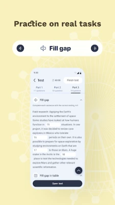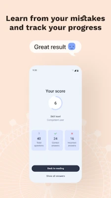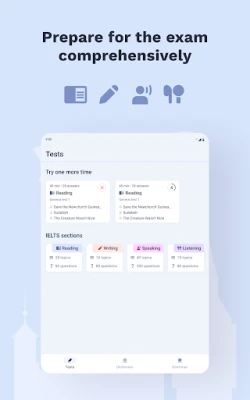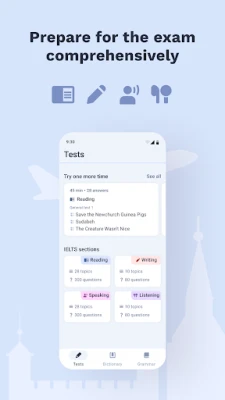 Preparing for IELTS? Our app offers comprehensive preparation for all four sections of the exam: Speaking, Listening, Reading and Writing. The practice tests are fully aligned with the official IELTS format, helping you not only to get used to the exam structure, but also to identify your strengths and weaknesses. This allows you to focus on the skills that need improvement.