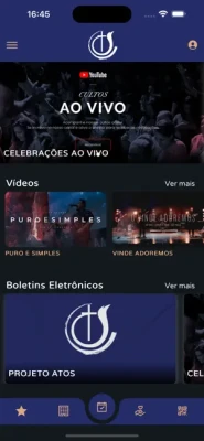 Conteúdos (Áudio/Vídeo): Permite visualizar e ouvir os conteúdos da Igreja disponíveis no App;