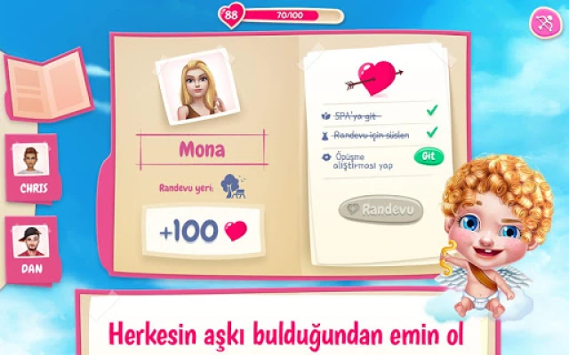 Bu romantik aşk hikayesi oyununda havada aşk kokusu var! Bir yay, ok ve kanatlarını tak ve aşk yaymaya başla. Müşterilerine onların çaresizce ihtiyacı olduğu aşk uzmanının sen olduğunu göster. Bazıları… şöyle diyelim… çalışması biraz zor insanlar. Senin işin onları aşka hazırlamak. Onların diğer insanları etkilemeleri için dış görünüşlerini, saç stillerini ve kıyafetlerini değiştir. Randevularının mükemmel geçtiğinden emin ol ve daha önemlisi ilk aşk öpücüğünü almalarını sağla!