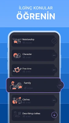 Kapsamlı konu başlıkları: aile, hobiler, eğitim, iş, alışveriş, teknoloji, sağlık, yiyecekler ve daha fazlasını kapsayan İngilizce dili. kendi kendini yetiştirme metodumuzla dilinizi geliştirin.