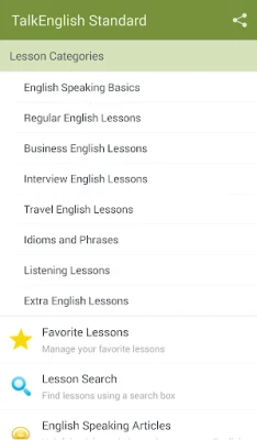 Talk English Standard, resmi Ücretsiz TalkEnglish.com Android Uygulamasıdır. İngilizce'yi akıcı olarak nasıl konuşacağınızı öğreten 900'ün üzerinde ders ve 8000 ses dosyası mevcuttur. Çoğu ders, ana dili İngilizce olan konuşmacıyı o cümleyi söylerken dinlemek için tıklayabileceğiniz birçok cümle içerir. Her ders sayfası ayrıca kendi kendinize kayıt yapabileceğiniz bir araca sahiptir. O cümleyi okurken kendi sesinizi kaydedebilir ve ana dili İngilizce olan konuşmacının ses dosyasıyla kıyaslayabilirsiniz.