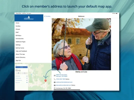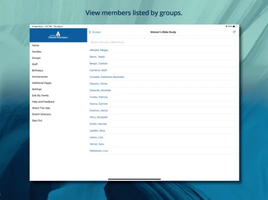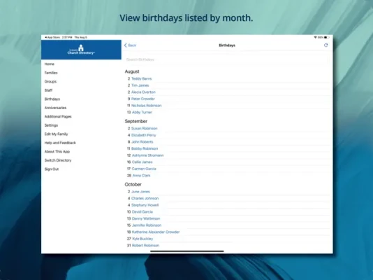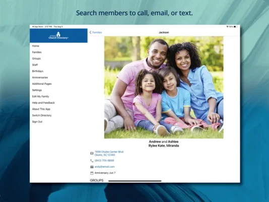Use Instant Church Directory to: - View family information and photos just like any traditional paper directory. - Search members to call, email, or text. - Click on member's address to launch your default map app. - View and search Staff Members and their contact information. - View members listed by groups. - View birthdays listed by month.
