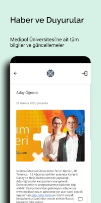 Bu uygulama sayesinde, İstanbul Medipol Üniversitesine ilişkin güncel etkinlik ve duyurulara erişim sağlayabilirsiniz. Kampüsünüzdeki tüm birimlere erişim sağlayabilir; servis saati, yemekhane menülerini takip edebilirsiniz.