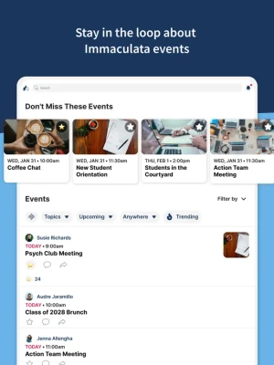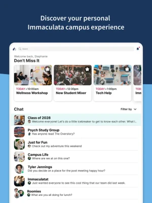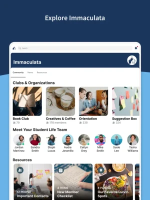Connect with your Immaculata community through a single, easy-to-use app. Chat and share information with groups that matter to you, stay updated on campus schedules and discover new communities through messaging, events and polls. Get involved in both in-person and virtual activities, easily access important resources and keep informed with campus news. Explore Immaculata and the surrounding area with maps and virtual tours, and connect with administrators, professors and even new friends.