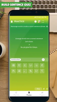 All the app's features are designed to help you learn to make Japanese sentences and improve the main skills: Listening to a sentence, writing (making) a sentence correctly, speaking a sentence/a phrase correctly.