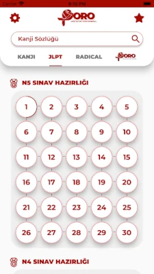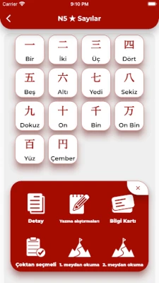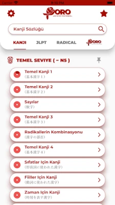 • 5 Kanji seviyesi: N5, N4, N3, N2, N1, seviyenizi seçmenize imkan sağlar.