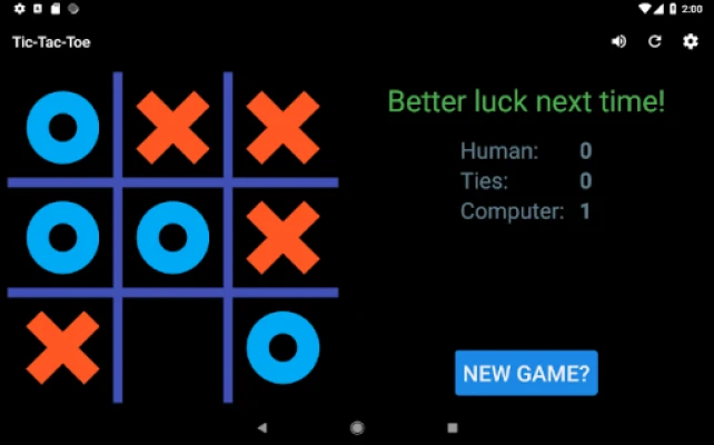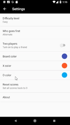 - Choose from 3 difficulty levels - One or two players - Choose the color of the game board, X and O - Keeps track of wins and losses