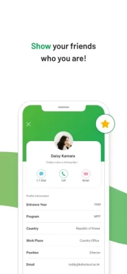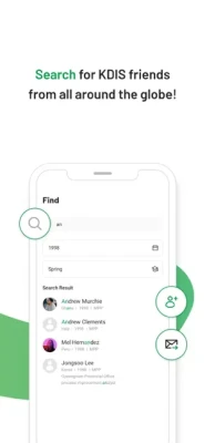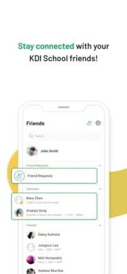 이름, 국가, 입학 연도, 학업 프로그램, 직종, 직장, 직위로 친구를 검색하고 대화를 시작할 수 있습니다. KDIS_connect는 동문 네트워크와 연결하는 완벽한 방법입니다!