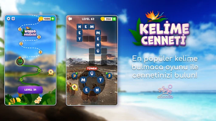 Eğlenirken beyin egzersizi yaptıran bir kelime oyununa hazır mısınız? Kelime Cenneti ile, zevkli ve akıcı kelime bulmacaları çözerken, dünyanın dört bir yanından çarpıcı doğa manzaralarının keyfini süreceksiniz. 5000'den fazla kelime bulmaca ve keşfedilecek 300 ilham verici mekan ile eğlenceniz hiç bitmeyecek!