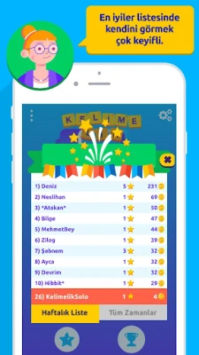 Kelimelik Solo oyunumuzda haftalık ve tüm zamanlar için en iyiler listesi gösterilmektedir. Bu listede sizin için otomatik olarak oluşturulan anonim bir isim ile yer alırsınız ve eğer isterseniz bu ismi bir kereliğine ücretsiz olarak değiştirebilirsiniz. Daha sonraki değişimler için ise ödeme yapmanız gerekmektedir.