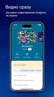 • Операции по картам: просмотр баланса по всем действующим картам, пополнение, просмотр истории операций, аналитика расходов, перевыпуск карт, просмотр полных реквизитов, управление лимитами по карте и многое другое