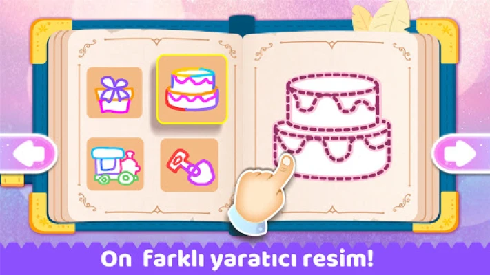 Bu oyunda resim çizmek çok kolay. Canlı resimler oluşturmak için tek ihtiyacın olan fırçaya dokunmak ve noktalı çizgiler üzerinden çizmek! Tereyağlı kek, Noel hediye kutusu, prenses elbisesi ve daha fazlası gibi görseller de dahil olmak üzere aralarından seçim yapabileceğin ve çizebileceğin 20 çizim sayfası bulunuyor.
