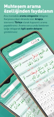 - Muhteşem arama özelliğinden faydalanın; Ana menüdeki arama simgesine tıkladığınızda ister Arapça, isterseniz Türkçe olarak kapsamlı arama yapabilirsiniz. Arama sonucunda listelenen içeğe tıklayarak ilgili ayetin detayını görebilirsiniz,