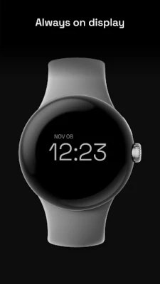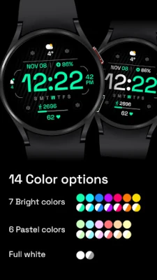 - Time display in 12 or 24 hour format - Optimized for battery life. - Date and day display - Battery life monitoring - Step counter with daily step goal of 10,000 - Heart rate monitoring - 4 shortcuts to favorite apps - Customizable complication (e.g. weather) - 28 different color options - Different background patterns