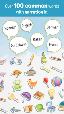 😍 Children will learn fun words by associating cute artwork with their proper pronunciation in Portuguese, Spanish, English, French, Italian and German - you can switch languages whenever you like! Three ways to learn: